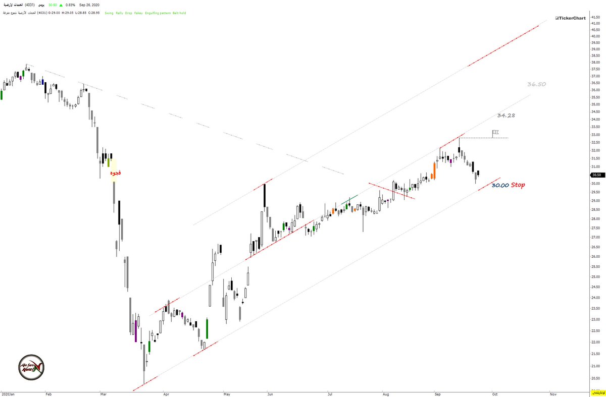 سهم الخدمات الارضيه السعر 30 35 الوقف 30 مقاومه 31 و31 50 و32 وبالله التوفيق.