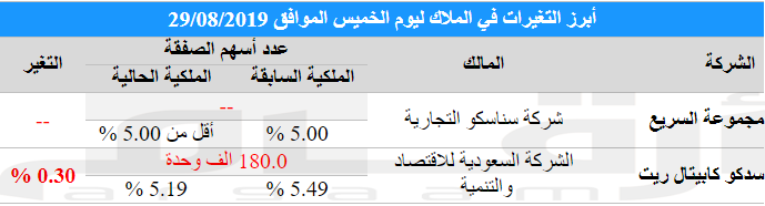 تغيرات كبار الملاك في السوق السعودي تاسي ليوم الخميس 29 أغسطس السريع سدكو كابيتال ريت